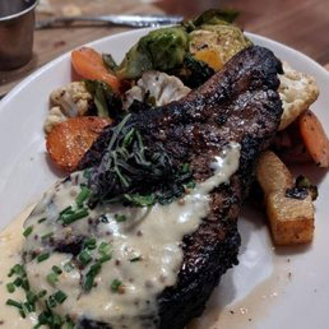A bone-in pork chop, slow-smoked with pecan wood, served with creamy grits, collard greens, and a bourbon-peach glaze.