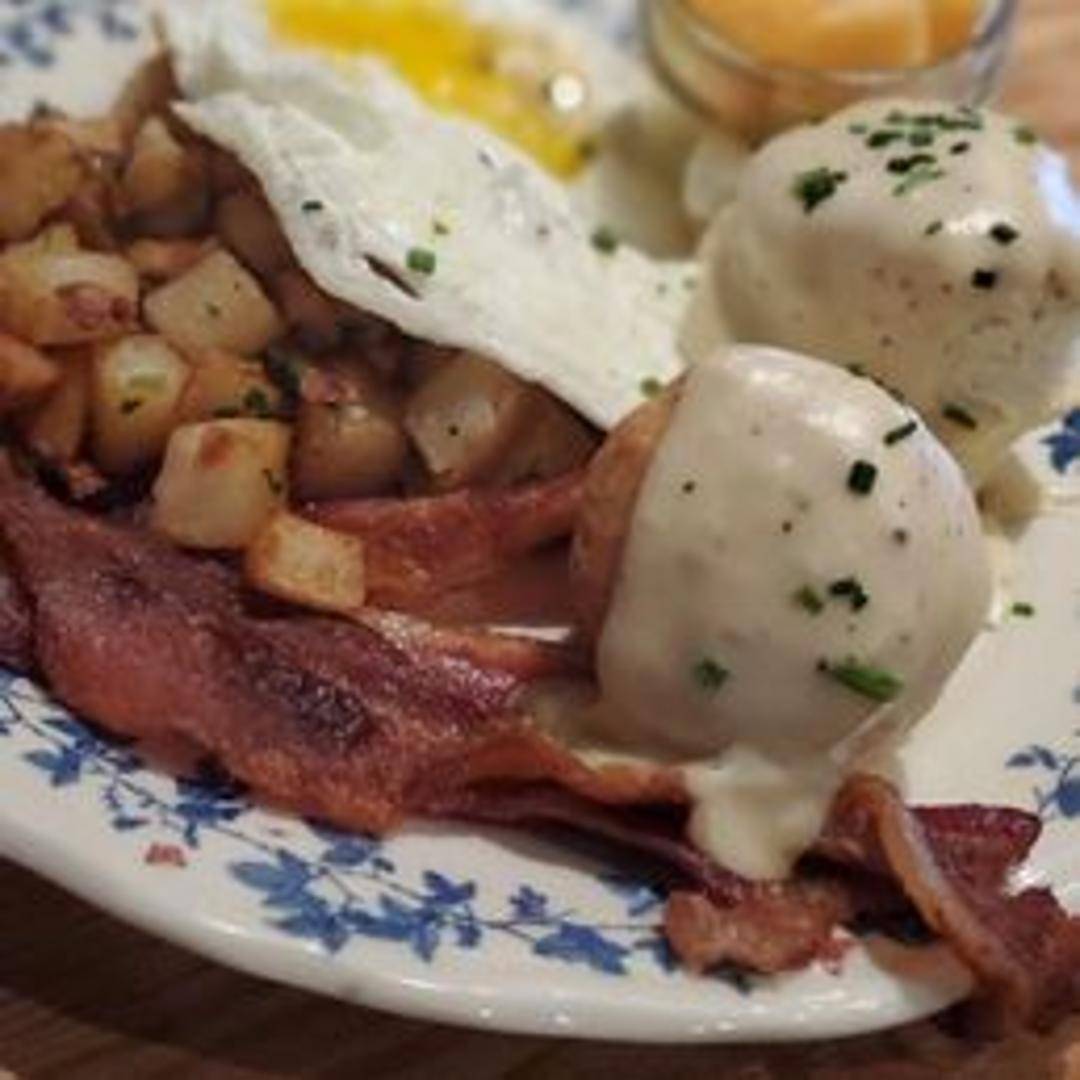 A hearty Southern-inspired breakfast plate featuring grits, eggs (cooked to your preference), choice of breakfast meat (such as bacon, sausage, or ham), and a biscuit. Often includes accompaniments like gravy or jam, representing the flavors of the Low Country.