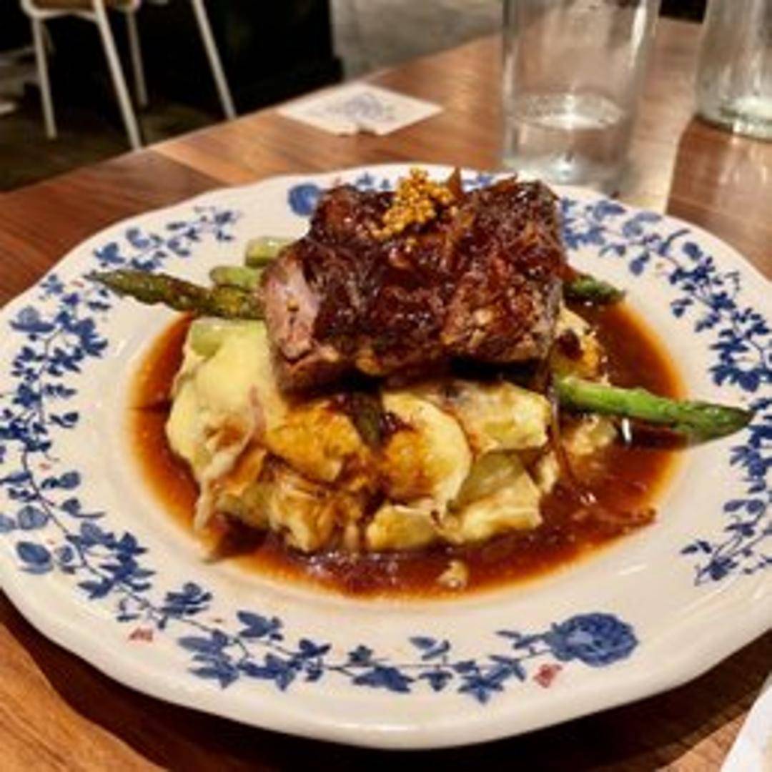 Slow-braised beef short rib, fall-off-the-bone tender, served over creamy mashed potatoes with a rich pan sauce and seasonal vegetables.