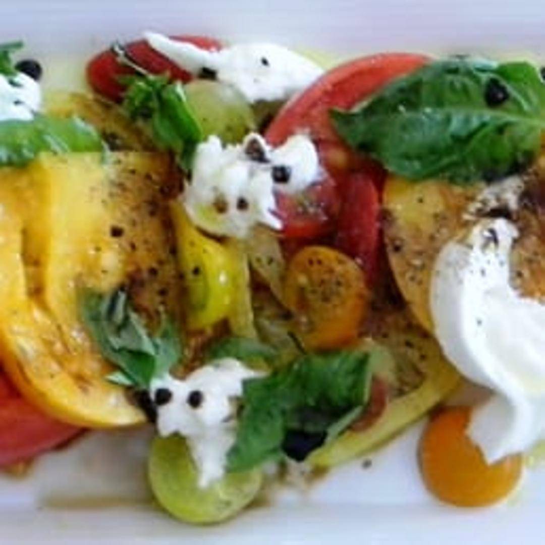 A quintessential Italian appetizer featuring slices of fresh, ripe tomatoes layered with creamy, soft mozzarella cheese and fragrant basil leaves. This vibrant salad is typically finished with a drizzle of extra virgin olive oil and sometimes a touch of balsamic glaze, offering a refreshing blend of flavors and textures.