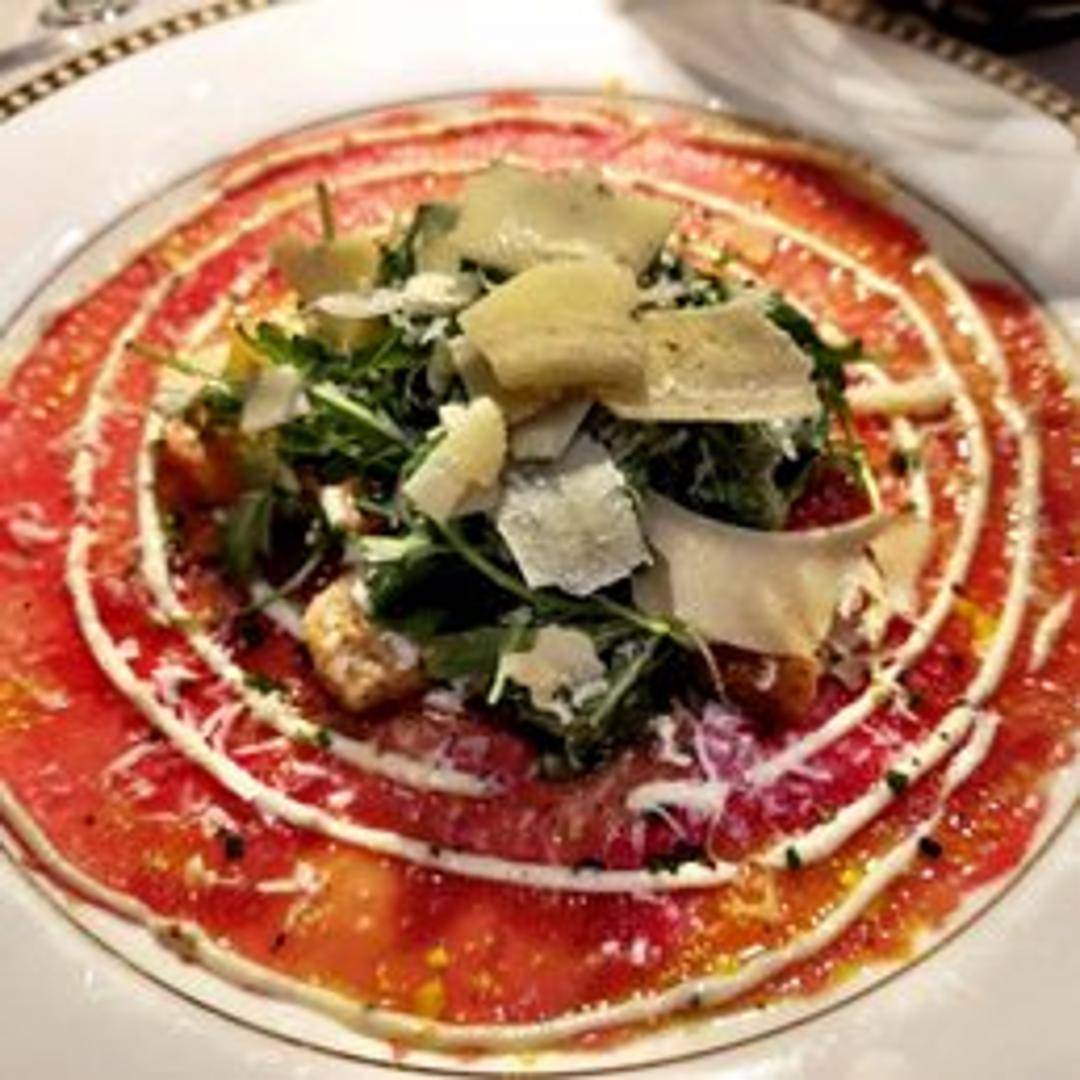 Thinly sliced raw beef tenderloin, drizzled with extra virgin olive oil, lemon juice, and topped with shaved Parmesan cheese and capers.
