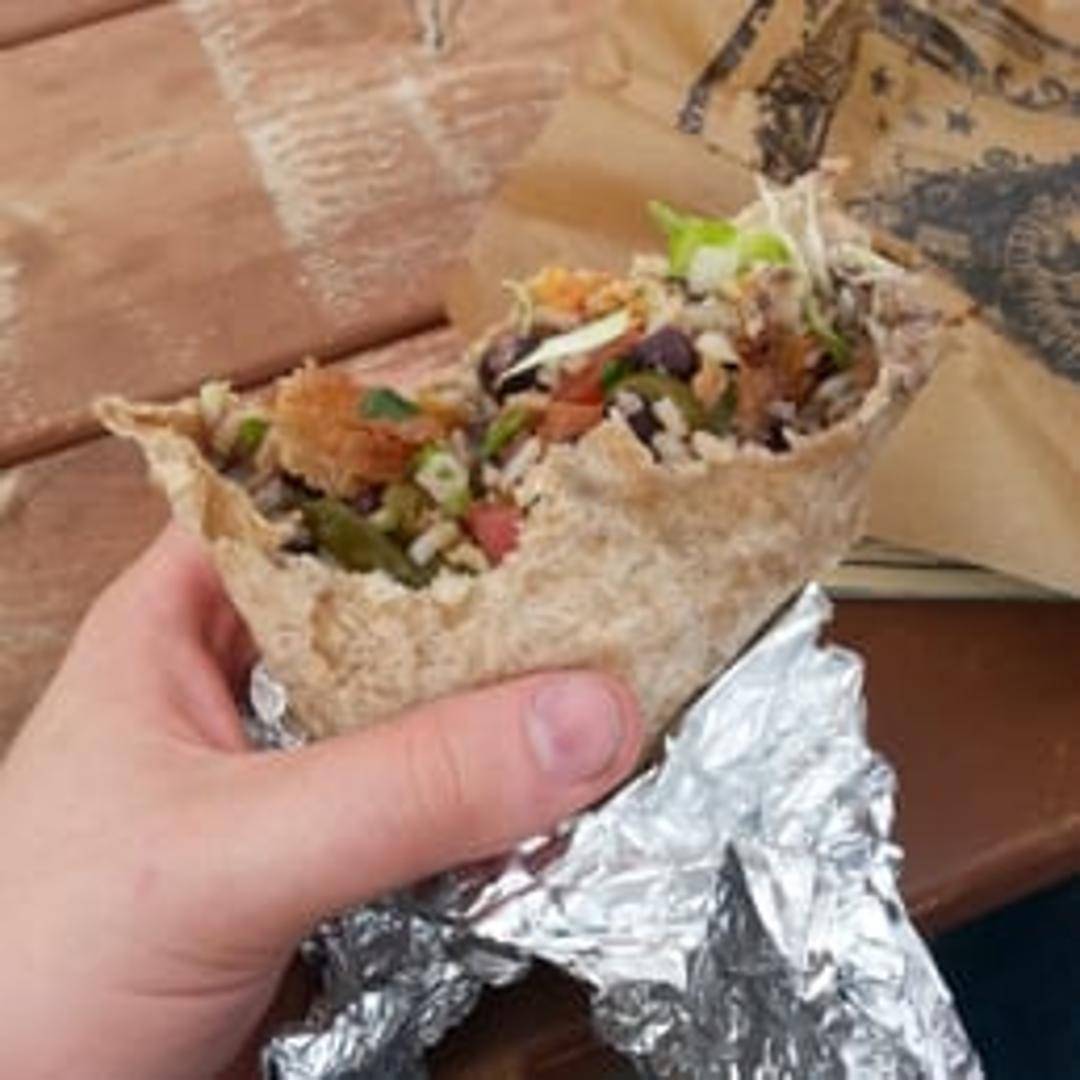 A large burrito filled with sustainable white fish, rice, beans, cheese, shredded cabbage, pico de gallo, and chipotle aioli, wrapped in a warm flour tortilla.