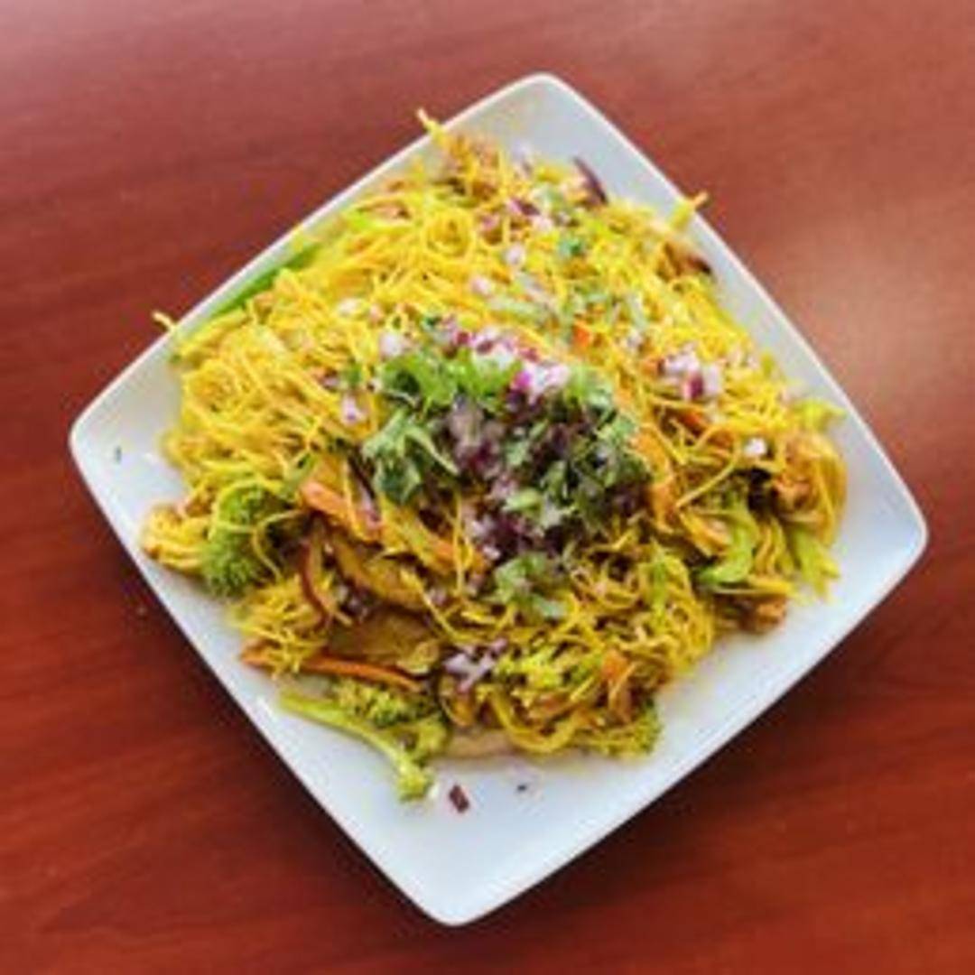 Stir-fried noodles with tender pieces of chicken and a medley of vegetables, seasoned with soy sauce and other savory sauces. A popular and satisfying Asian-inspired dish.
