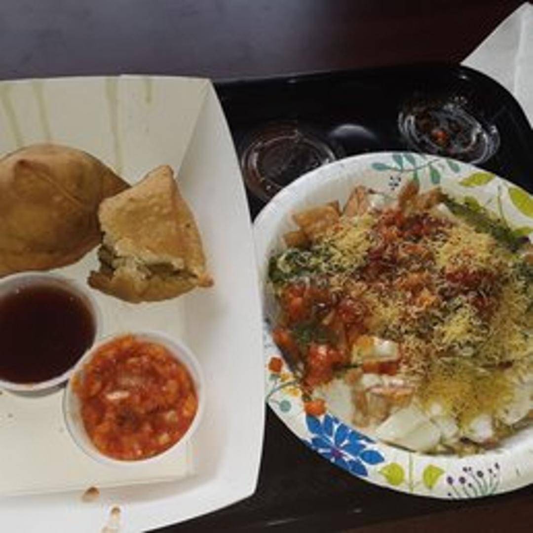 A crispy, tangy, and refreshing Indian street food. Crispy fried dough wafers (papdi) are topped with creamy yogurt (dahi), sweet tamarind chutney, spicy green chutney, potatoes, chickpeas, and a sprinkle of sev (crispy chickpea noodles) and spices. A delightful explosion of flavors and textures in every bite.