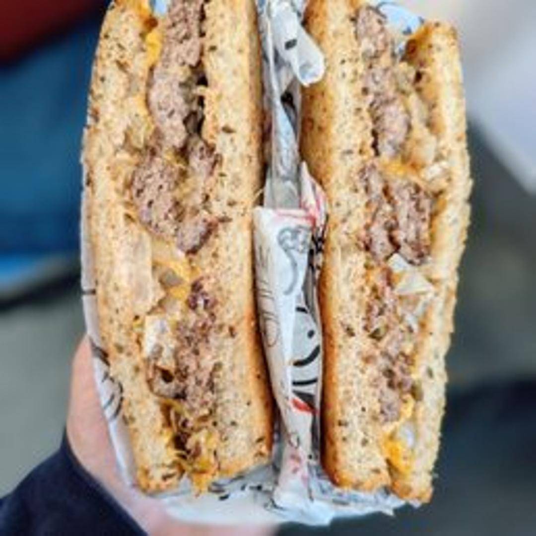 A juicy beef patty grilled with melted Swiss cheese and caramelized onions, served on grilled rye bread.