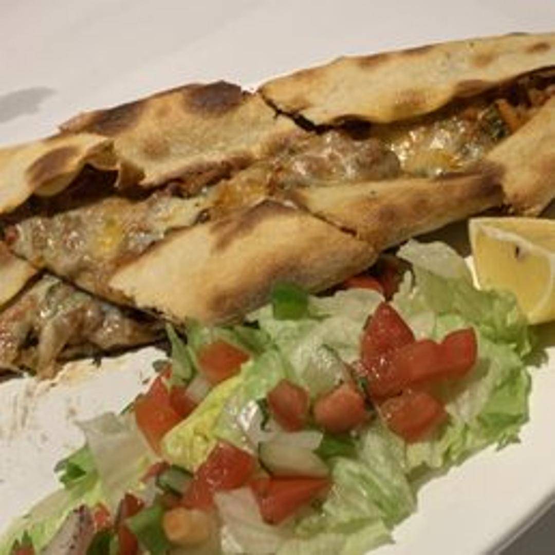 A traditional Turkish flatbread, skillfully shaped like a boat, generously topped with finely minced seasoned lamb, fresh vegetables, and aromatic herbs, then baked until golden brown. This robust and comforting dish truly embodies the authentic flavors of Turkish cuisine.