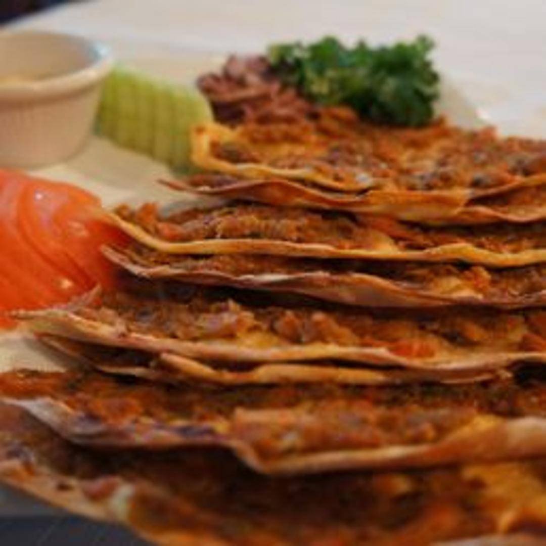A delightful, thin and crispy Turkish flatbread, generously topped with a savory mixture of finely minced beef and lamb, fresh tomatoes, bell peppers, onions, and aromatic herbs. Baked to perfection, it's often enjoyed with a refreshing squeeze of lemon and a sprinkle of fresh parsley.