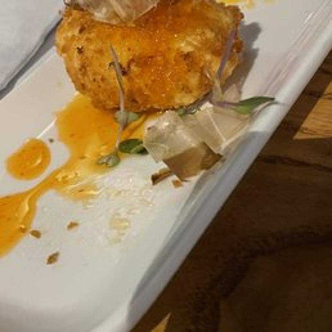Crispy, golden-brown potato croquettes filled with melted cheese. Served hot.