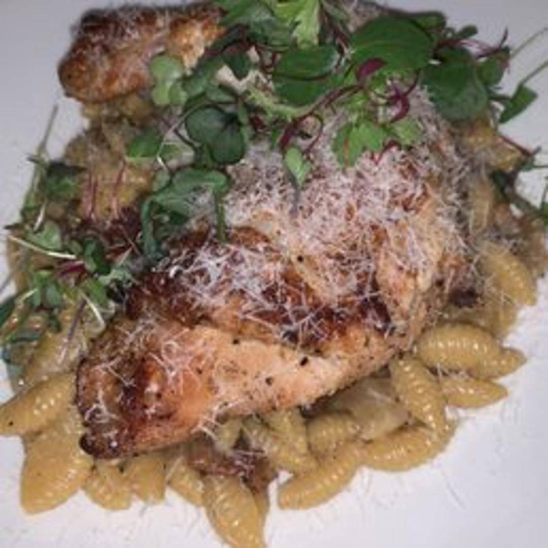 Savor our exquisite Chicken Cavatelli Carbonara, a sophisticated twist on a beloved Italian classic. This comforting dish features tender, succulent pieces of pan-seared chicken, perfectly tossed with our house-made cavatelli pasta. Each bite is enveloped in a luscious, velvety Carbonara sauce, traditionally crafted with rich egg yolks, grated Pecorino Romano cheese, and freshly cracked black pepper. Crispy rendered pancetta adds a delightful smoky depth and textural contrast, completing this harmonious blend of flavors. Garnished with fresh parsley, it's a hearty and satisfying entrée that delivers warmth and flavor in every forkful.