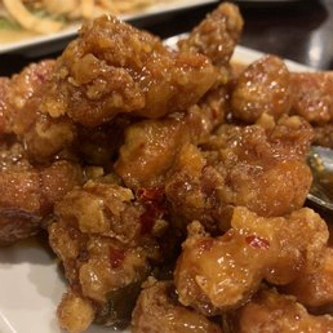Crispy, tender chicken pieces coated in a tangy and slightly sweet orange-flavored sauce. Served with steamed rice.