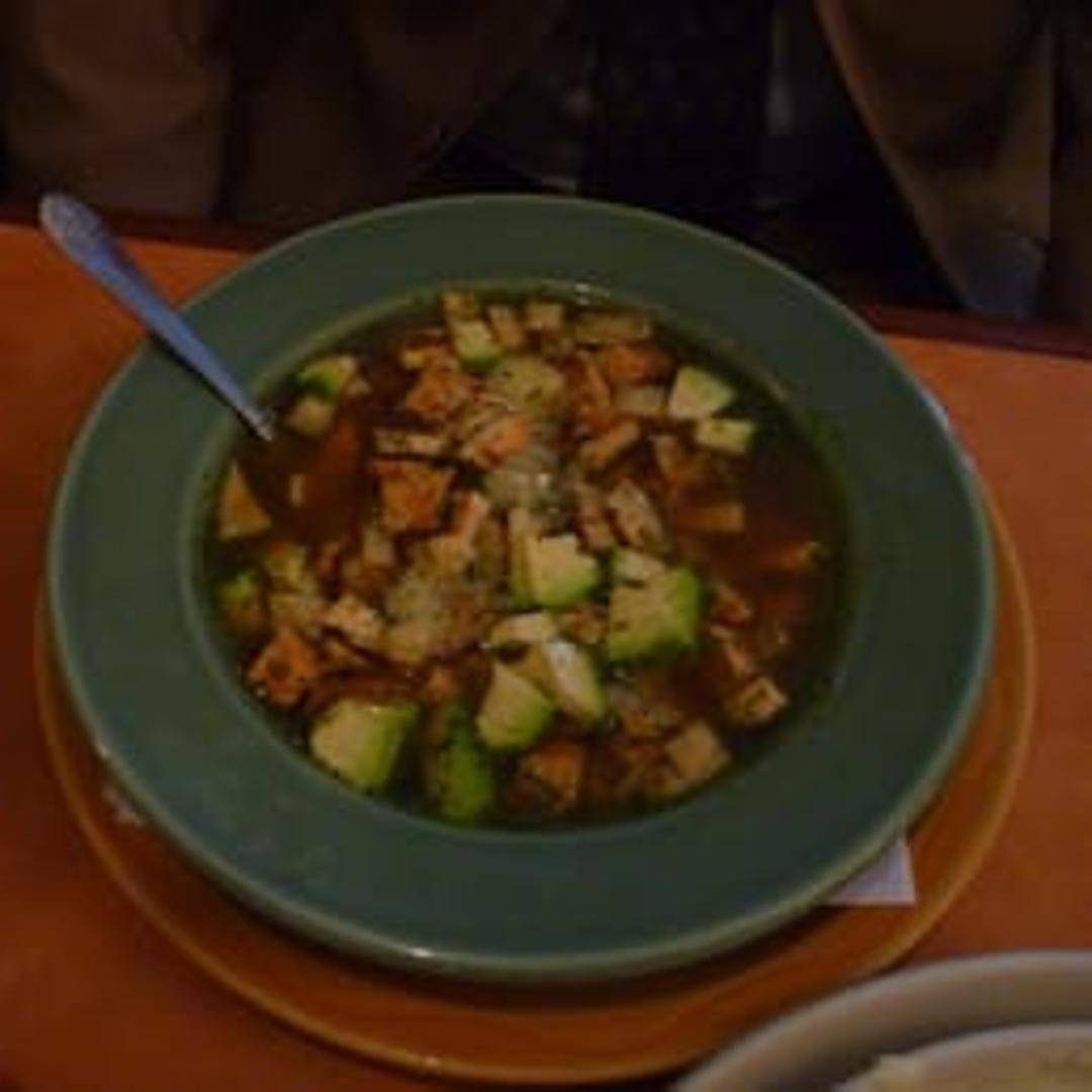 A hearty and flavorful soup featuring a rich tomato broth, shredded chicken, avocado, cheese, and crispy tortilla strips. Garnished with a lime wedge.