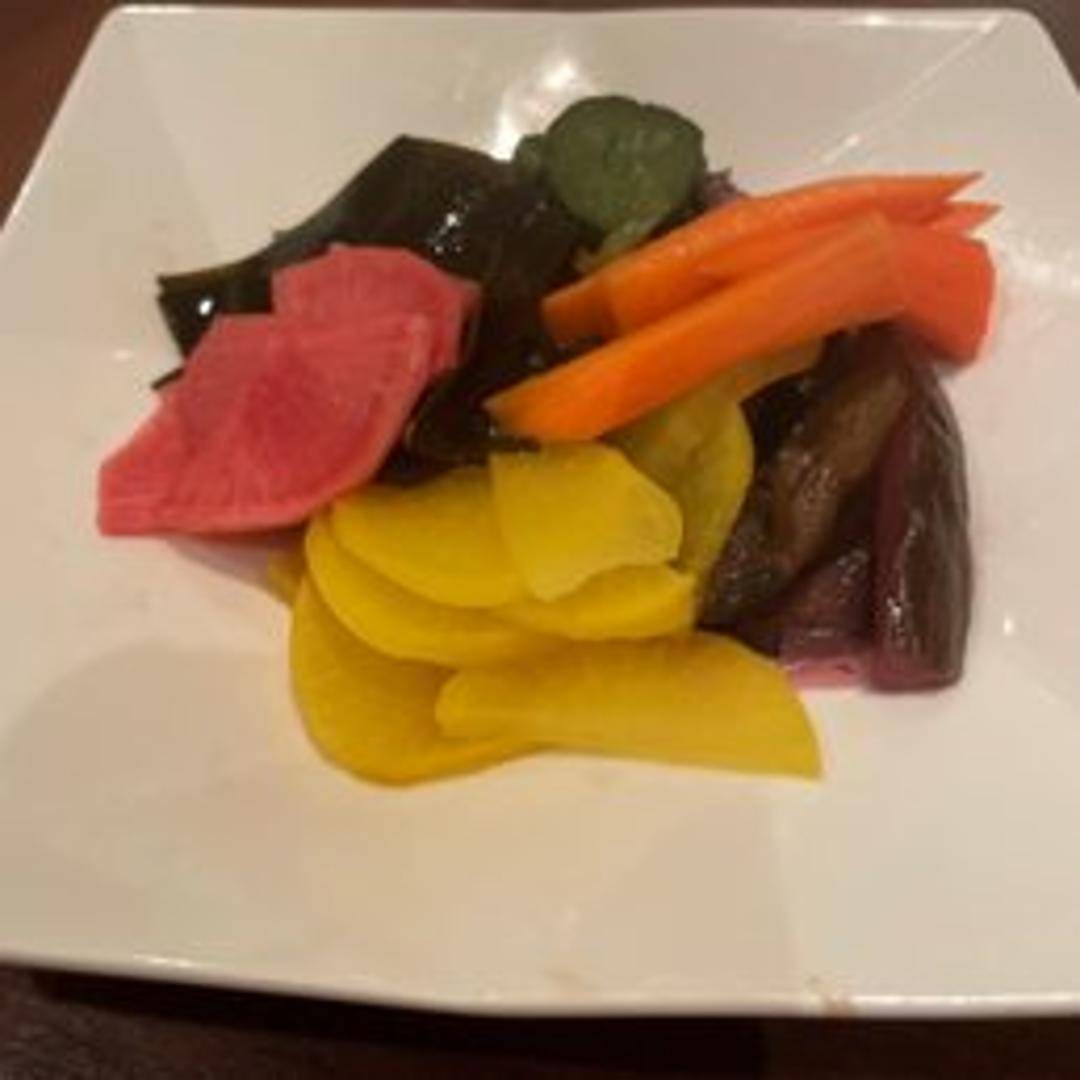 An assortment of Japanese pickled vegetables, offering a variety of flavors and textures, perfect as a palate cleanser.