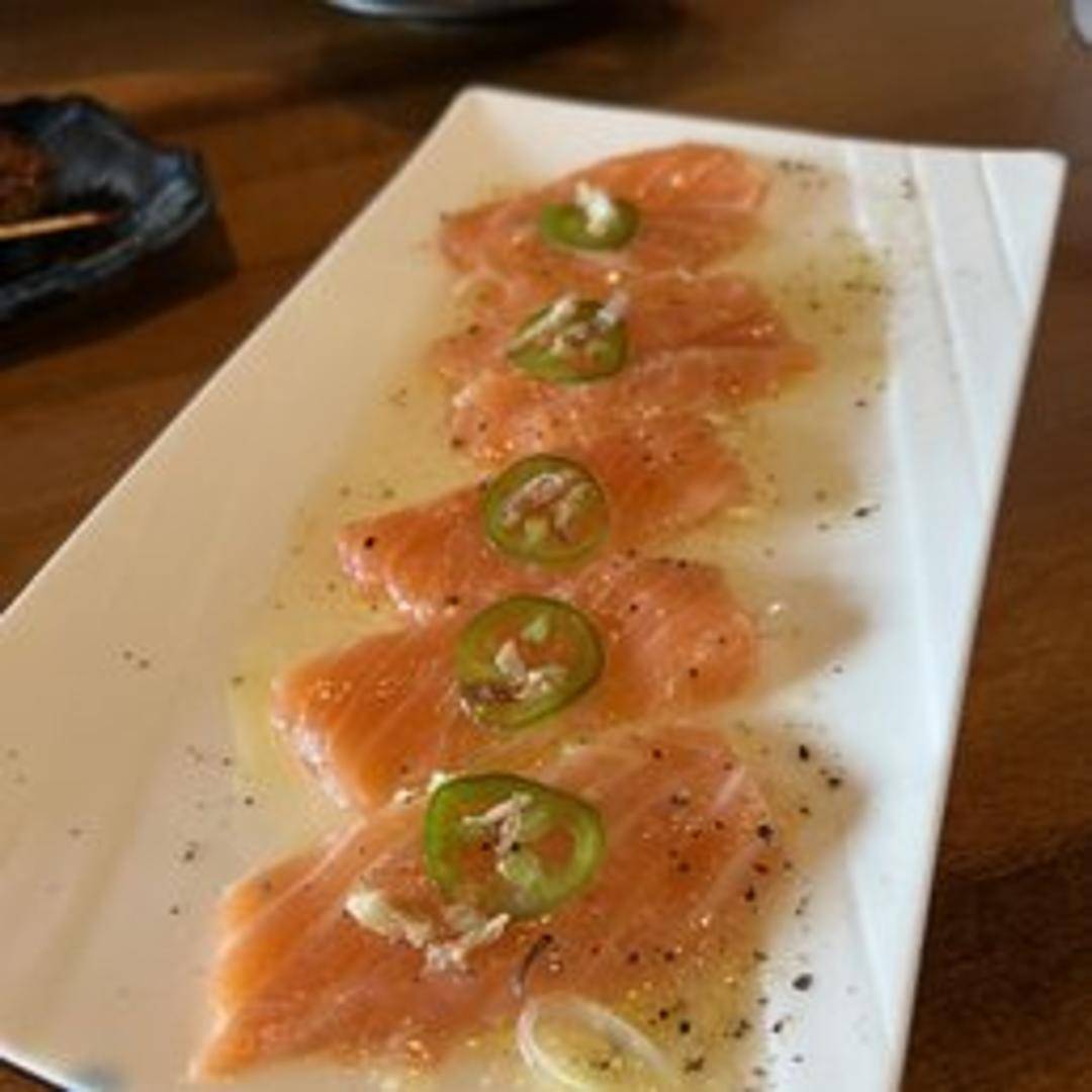 Thinly sliced, fresh raw salmon drizzled with a light citrus vinaigrette and garnished with capers, red onions, and fresh herbs. A delicate and refreshing appetizer.