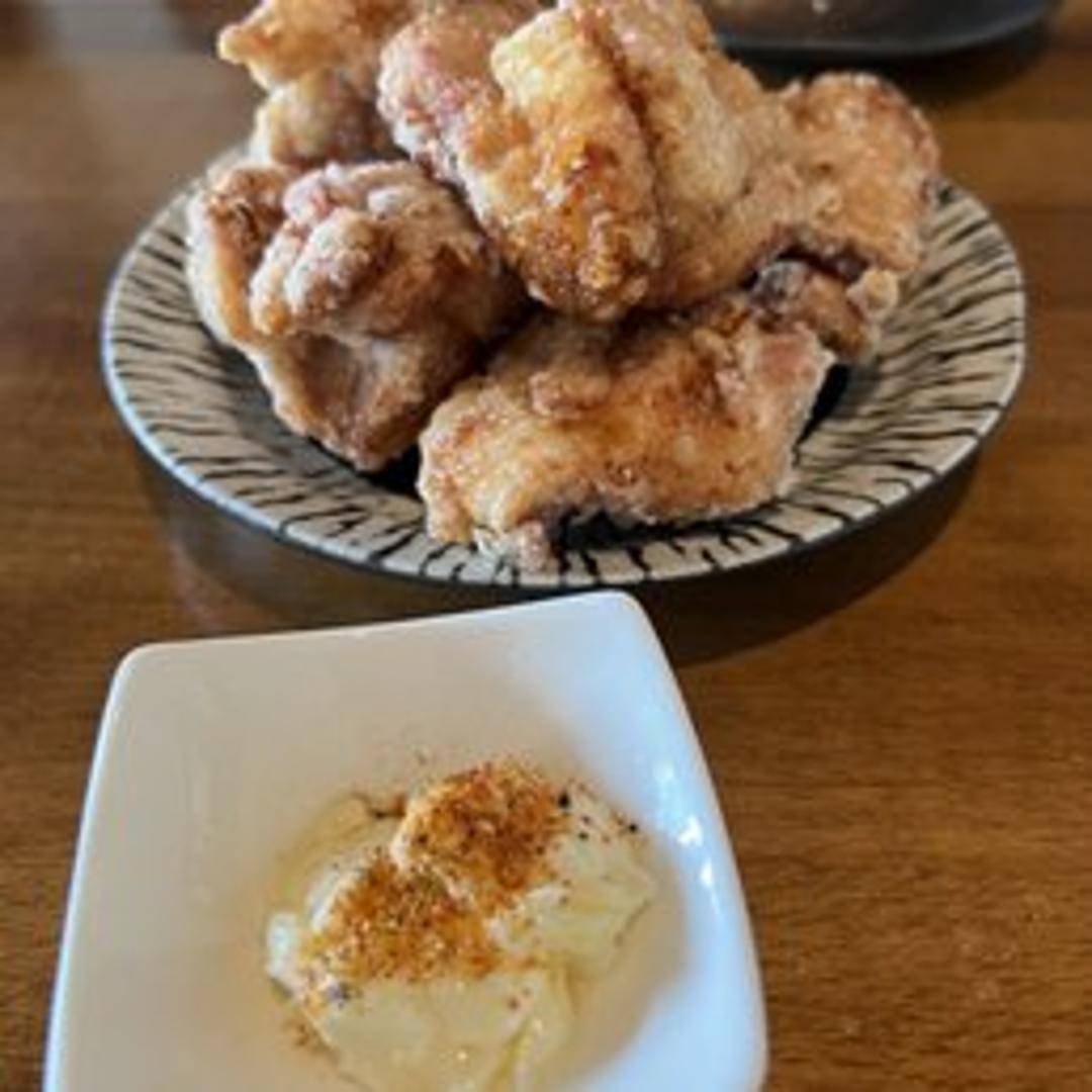 Japanese fried chicken. Marinated chicken pieces are coated in a light batter and deep-fried to a crispy golden brown. Served with a side of mayonnaise or lemon wedge.