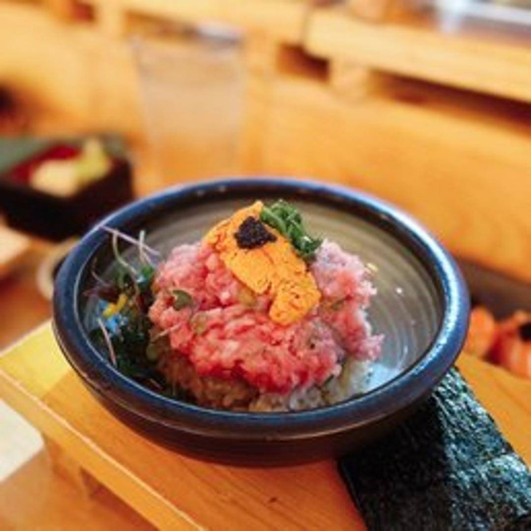 An opulent and highly sought-after culinary creation, this bowl showcases the unparalleled richness of premium ingredients. It features glistening slices of fatty tuna (toro), known for its melt-in-your-mouth texture and exquisite marbling, alongside generous portions of creamy, briny sea urchin (uni). These delicacies are artfully arranged over a bed of perfectly seasoned sushi rice, offering a truly decadent and unforgettable seafood experience.