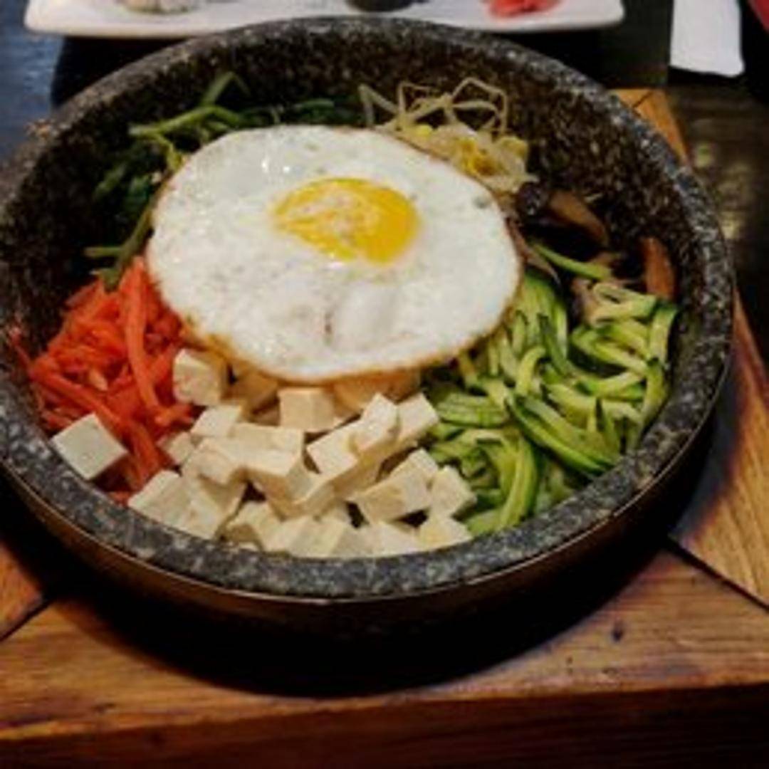 Experience the iconic Korean mixed rice dish, served sizzling in a hot stone bowl ('dolsot') to create a delicious crispy rice crust at the bottom. This vibrant bowl is artfully arranged with seasoned vegetables (namul), tender marinated meat (often beef), and a fried egg, meant to be mixed with a dollop of spicy gochujang sauce for a comforting and customizable meal.