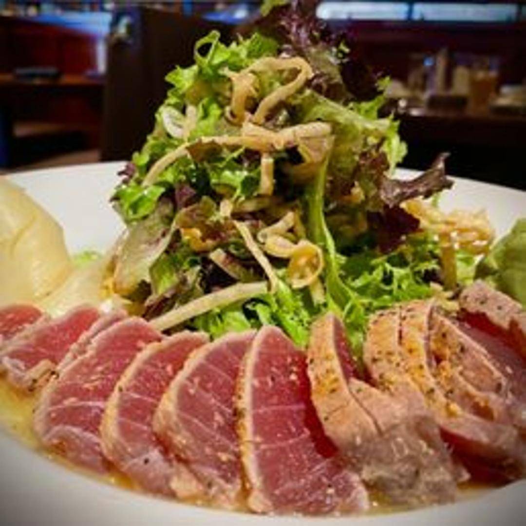 Seared Ahi Tuna served rare over mixed greens with avocado, mango, and a ginger-lime vinaigrette.