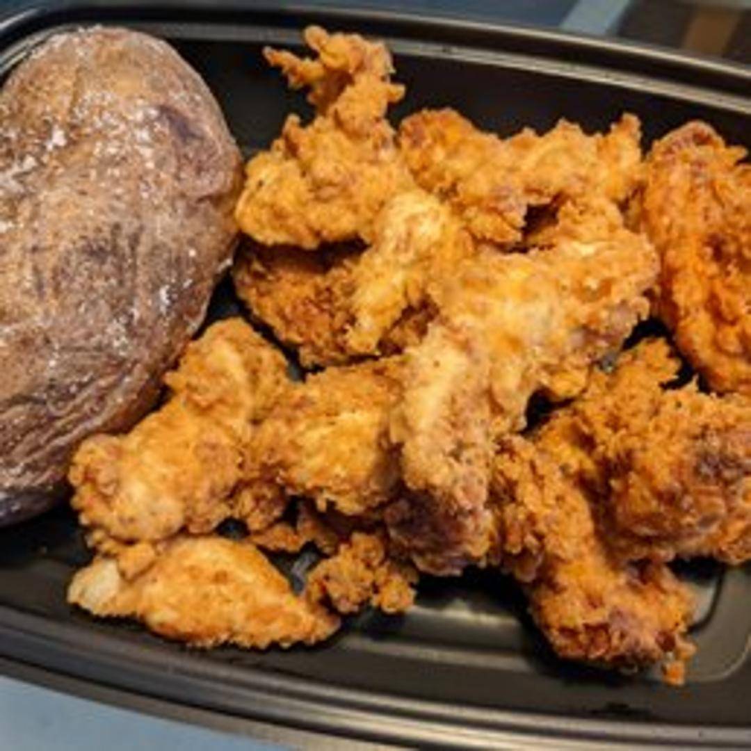 Crispy, hand-breaded chicken tenders served with honey mustard and French fries.