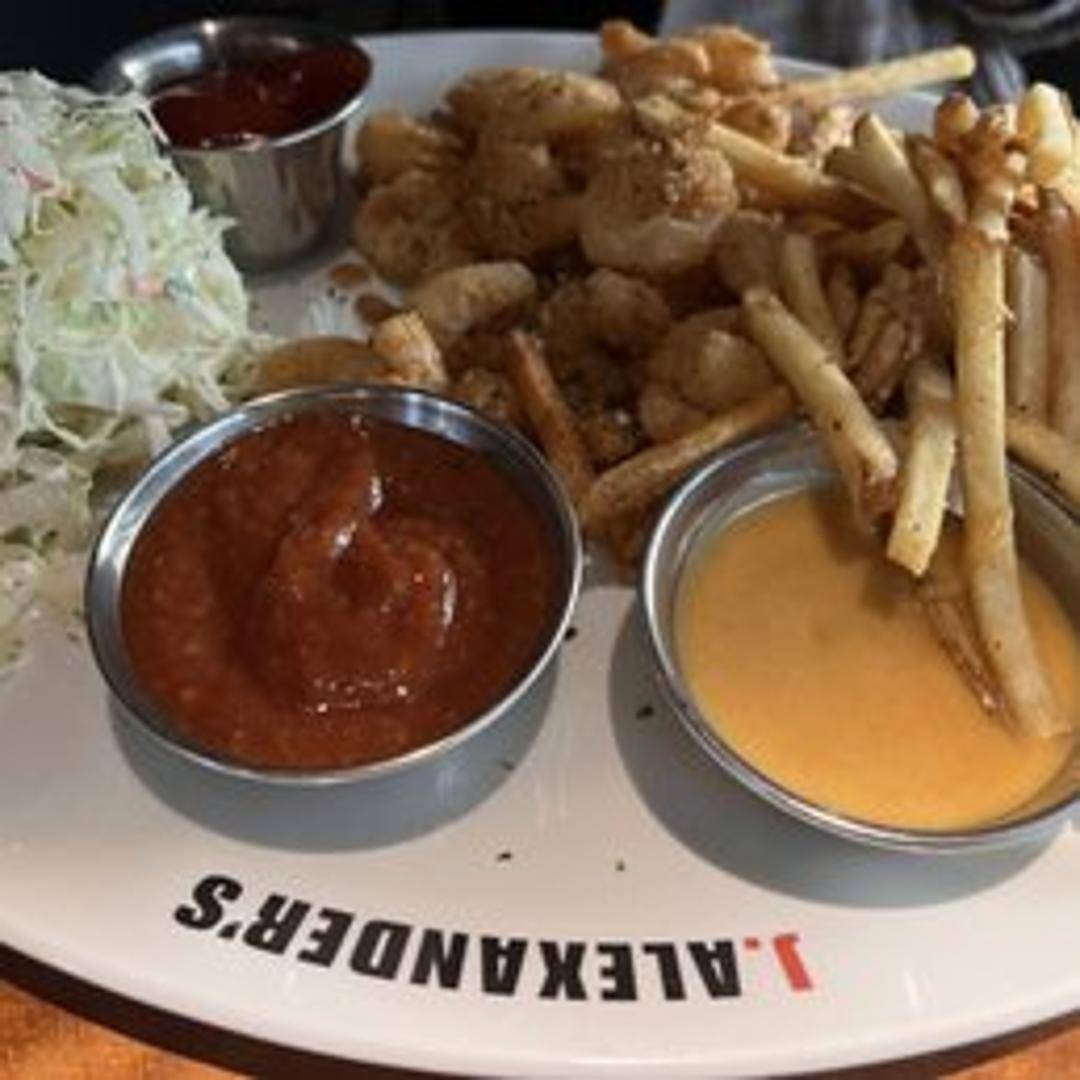 Succulent shrimp lightly breaded and fried to a golden crisp, delivering a delightful crunch with every bite. This generous plate is served with a classic cocktail sauce and offers a satisfying seafood experience, complete with your choice of side.