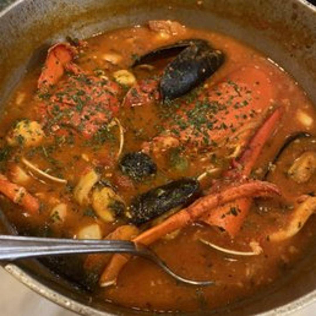 A traditional Portuguese seafood stew brimming with a variety of fresh seafood such as shrimp, clams, mussels, and sometimes lobster or crab, simmered in a rich tomato-based broth with herbs and spices.