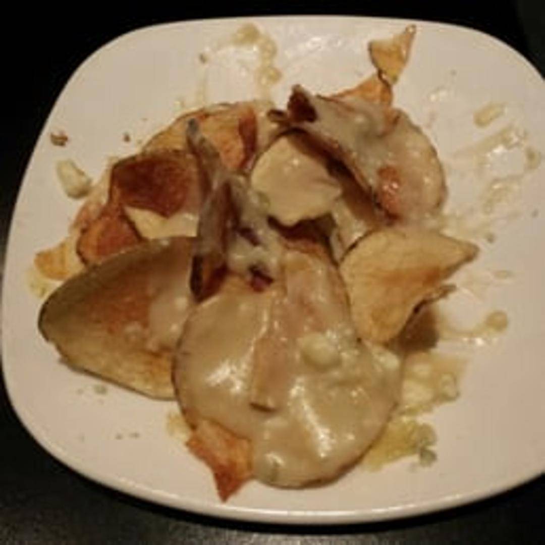 Crispy, house-made potato chips generously topped with a warm, savory blue cheese sauce. Often enhanced with additional garnishes for a bold, tangy, and unforgettable flavor profile.