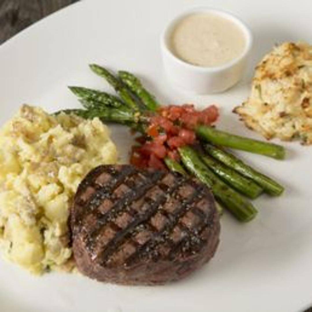 A meticulously grilled, exceptionally tender filet mignon, prepared to your preference and served as part of a curated combination. This pairing creates a complete and exquisite entree, often complemented by another premium selection.