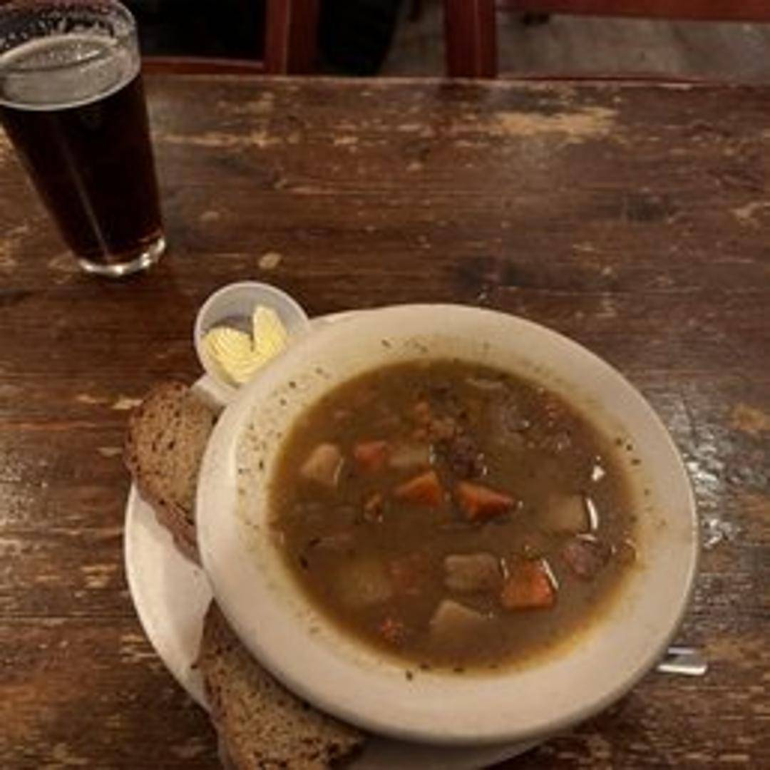 A hearty stew featuring tender lamb, potatoes, carrots, and onions in a savory broth.