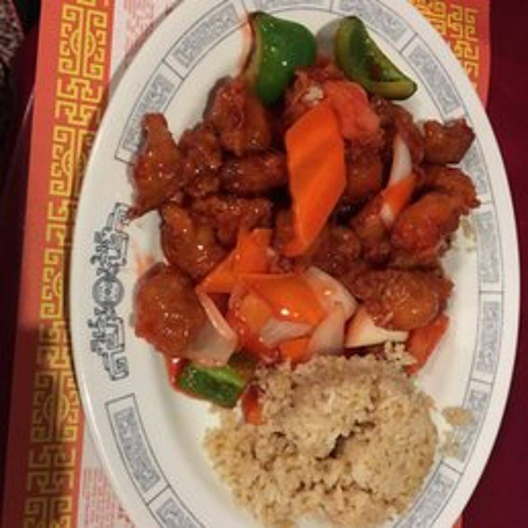 Tender pieces of pork, lightly battered and fried to a golden crisp, then coated in a vibrant, tangy sweet and sour sauce. Served with chunks of pineapple, bell peppers, and onions.
