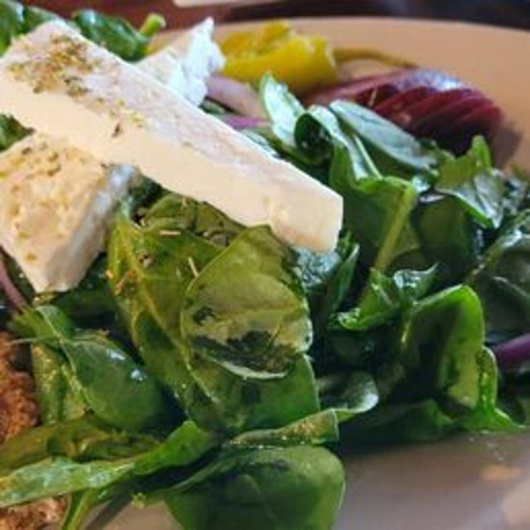 Roasted beets tossed with mixed greens, feta cheese, and a light vinaigrette.