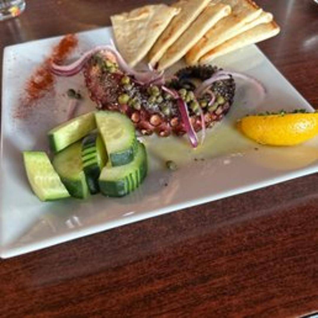 Tender grilled octopus drizzled with olive oil and lemon, seasoned with herbs.