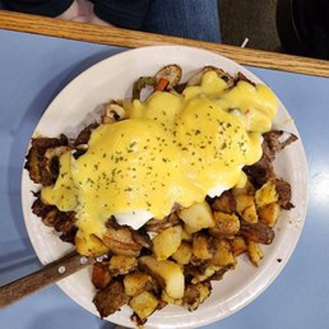 Two poached eggs and sliced ham atop toasted English muffins, smothered in a rich and creamy hollandaise sauce. Served with your choice of side.