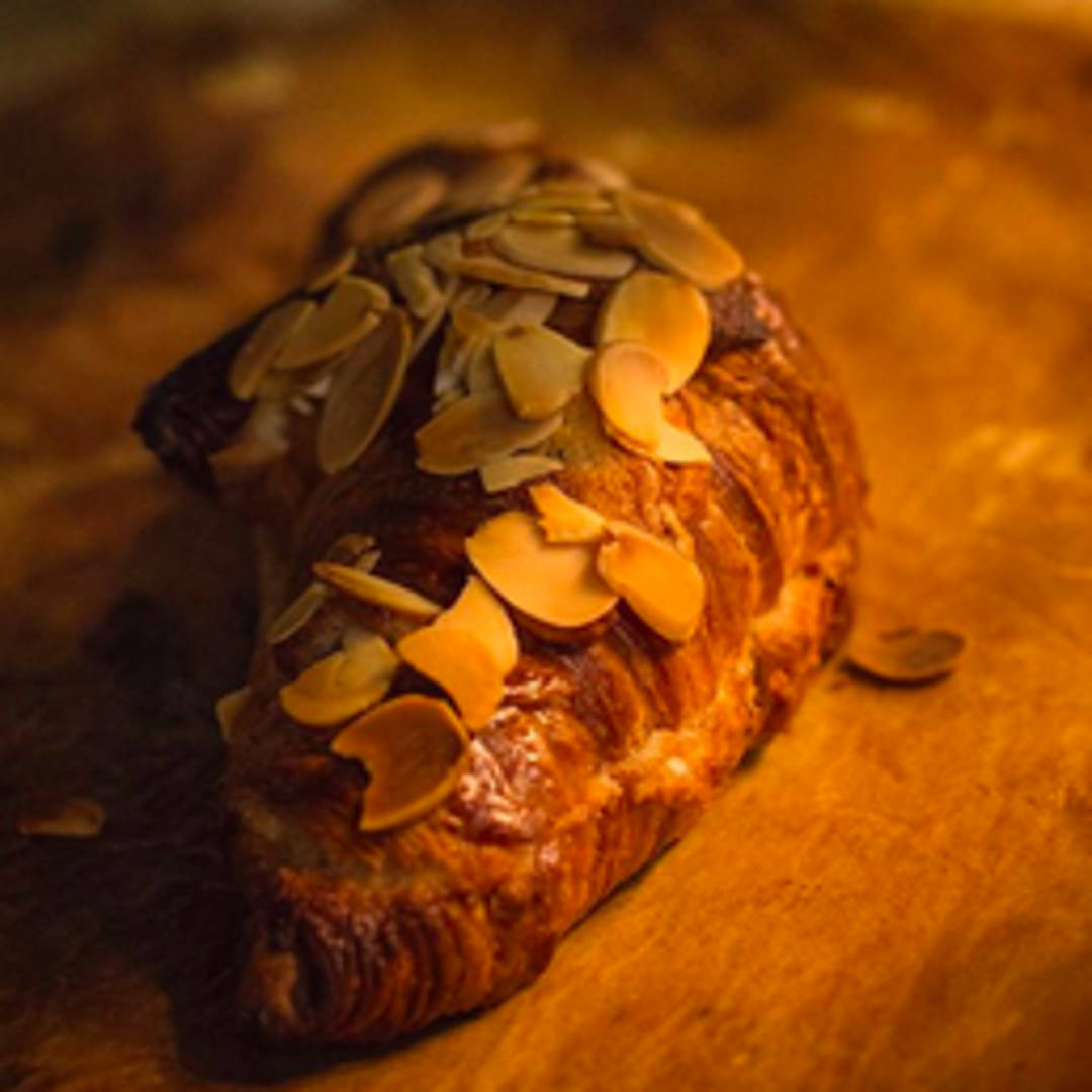 A flaky and buttery croissant filled with almond paste and topped with sliced almonds. The croissant is baked to a golden brown, resulting in a crispy exterior and a soft, almond-flavored interior. Often dusted with powdered sugar.