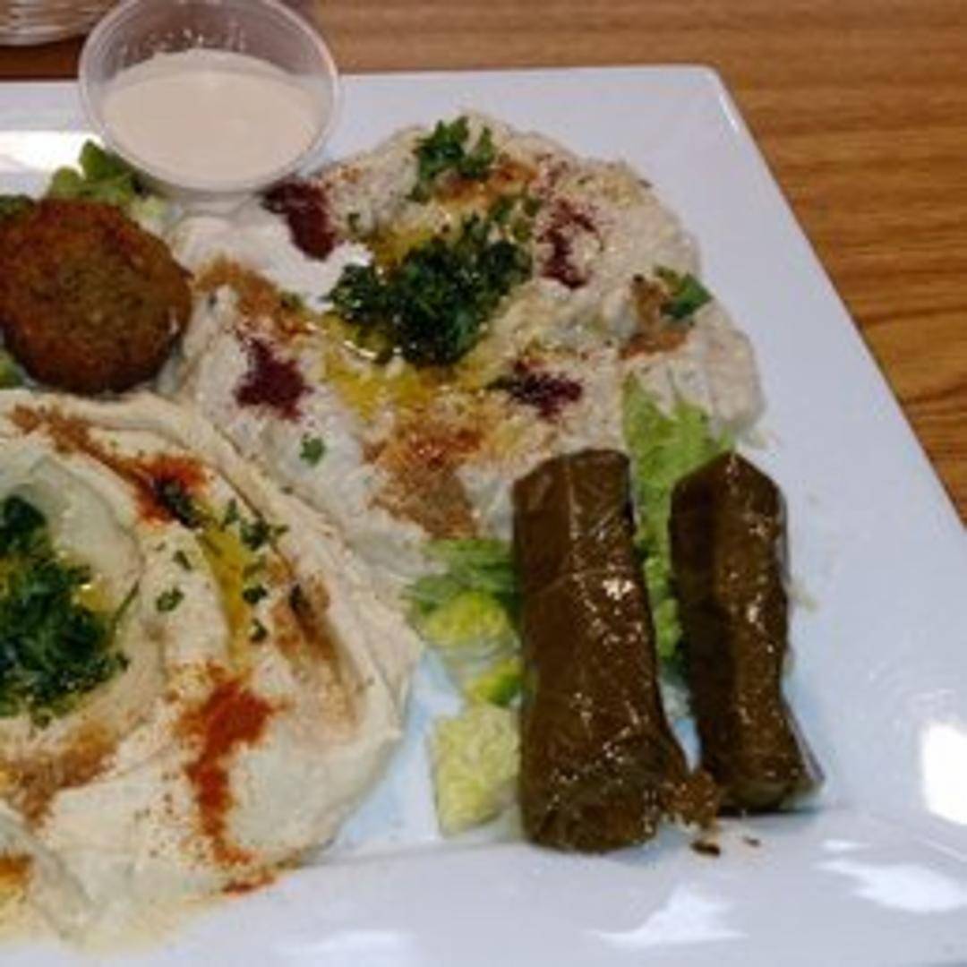 A wholesome and satisfying vegetarian plate designed to offer a complete Middle Eastern culinary experience. This ensemble includes our creamy hummus, tender grape leaves, golden crispy falafel, and a fresh side salad, all accompanied by fluffy rice or warm pita bread. It's a balanced and flavorful choice for a healthy and hearty meal.