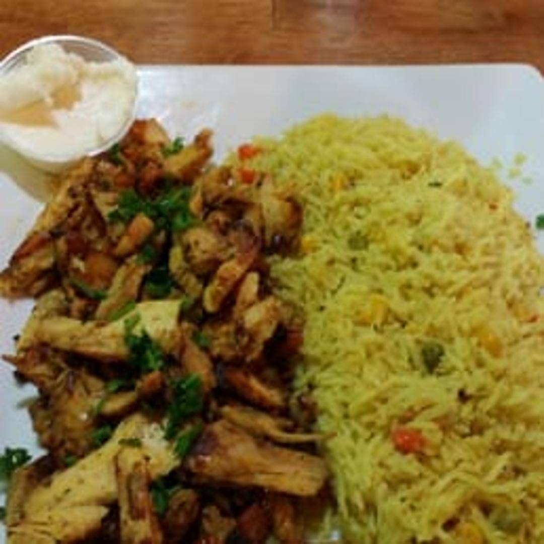 Enjoy our classic Chicken Shawarma Sandwich, featuring thinly sliced, perfectly seasoned chicken, slow-cooked on a rotisserie until tender and flavorful. Served in a warm pita bread, generously filled with fresh lettuce, tomatoes, pickles, and topped with our house-made garlic sauce for an unforgettable taste.