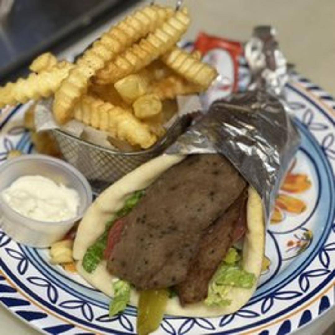 Savory meat, typically lamb or beef, slow-cooked on a vertical rotisserie, thinly sliced, and served in warm pita bread with tomatoes, onions, and tzatziki sauce.