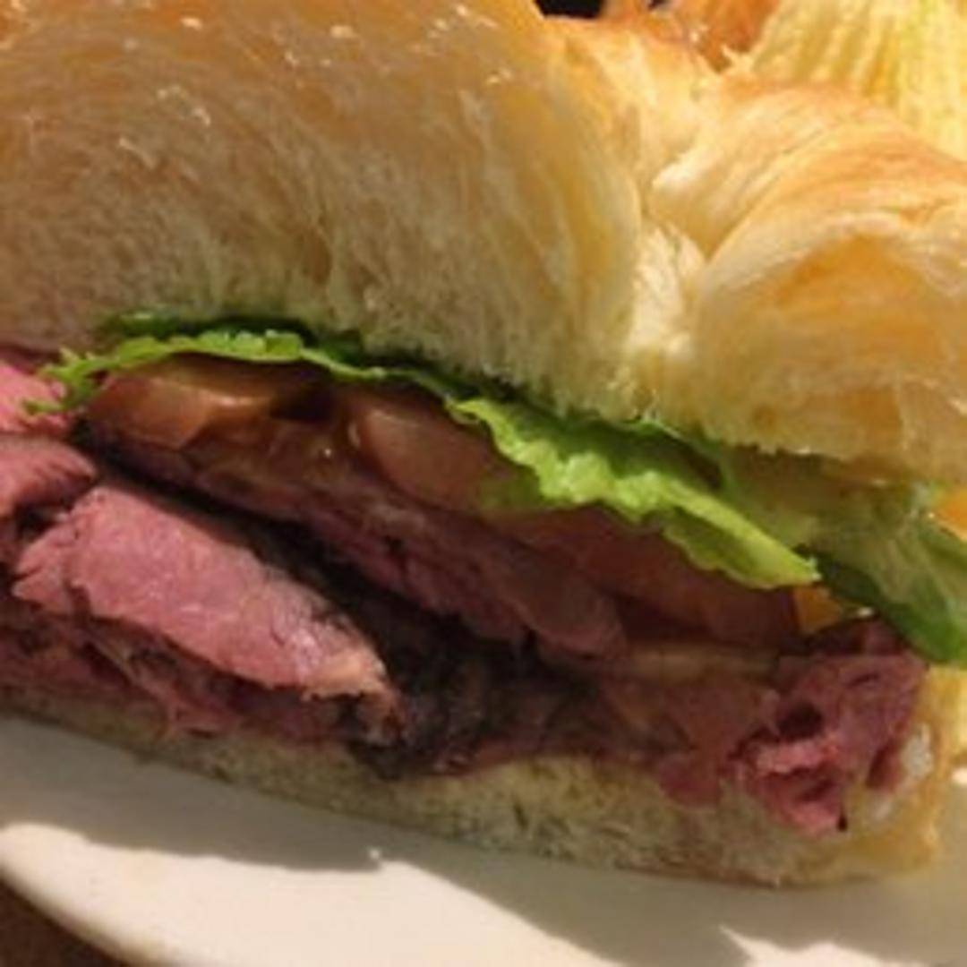 Thinly sliced, lean roast beef. Served on your choice of bread with your choice of toppings. Common toppings include lettuce, tomato, onion, mustard, mayonnaise, and horseradish. Bread options typically include white, wheat, rye, croissant, and gluten-free options.