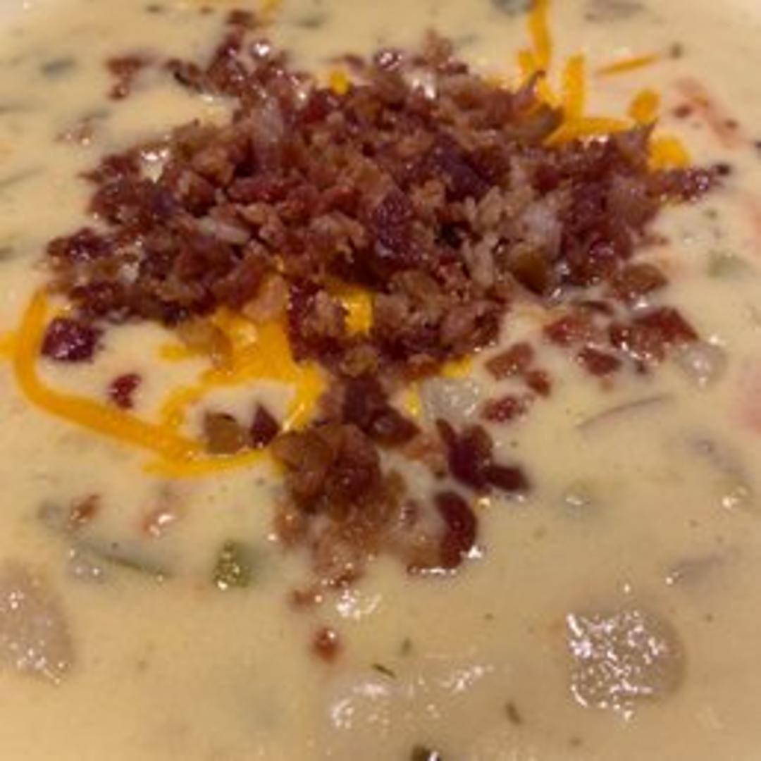 A creamy and comforting soup featuring tender potatoes, savory seasonings, and often garnished with cheddar cheese, bacon bits, and green onions. The specific recipe and availability may vary depending on the season.
