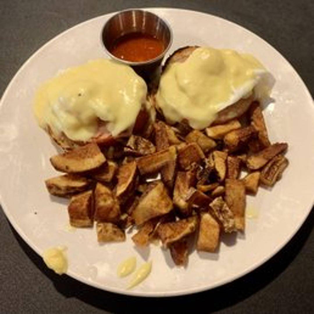 Two poached eggs on top of a toasted English muffin with Canadian bacon, topped with hollandaise sauce.