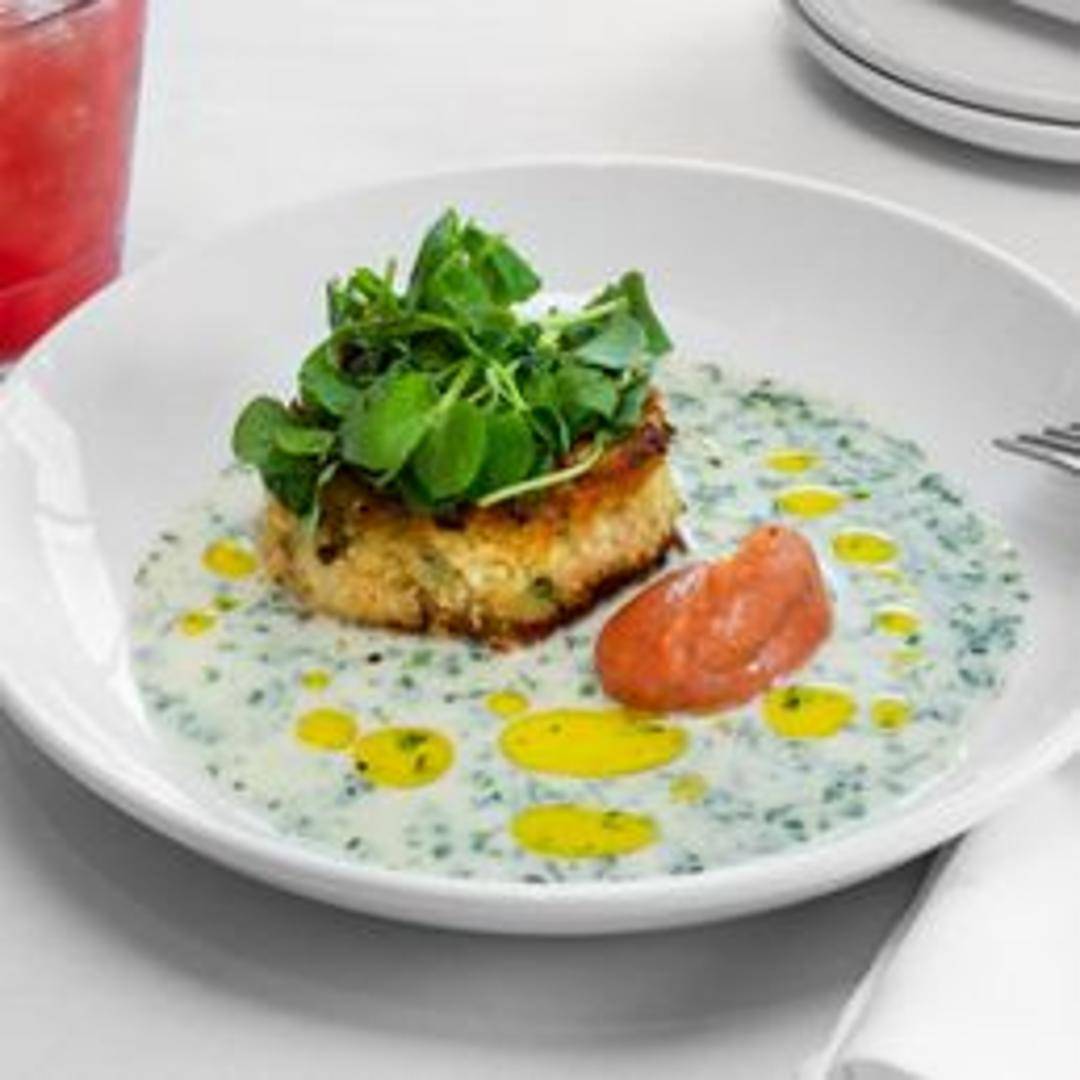Jumbo lump crab cake, pan-seared and served with a remoulade sauce and a side of mixed greens.