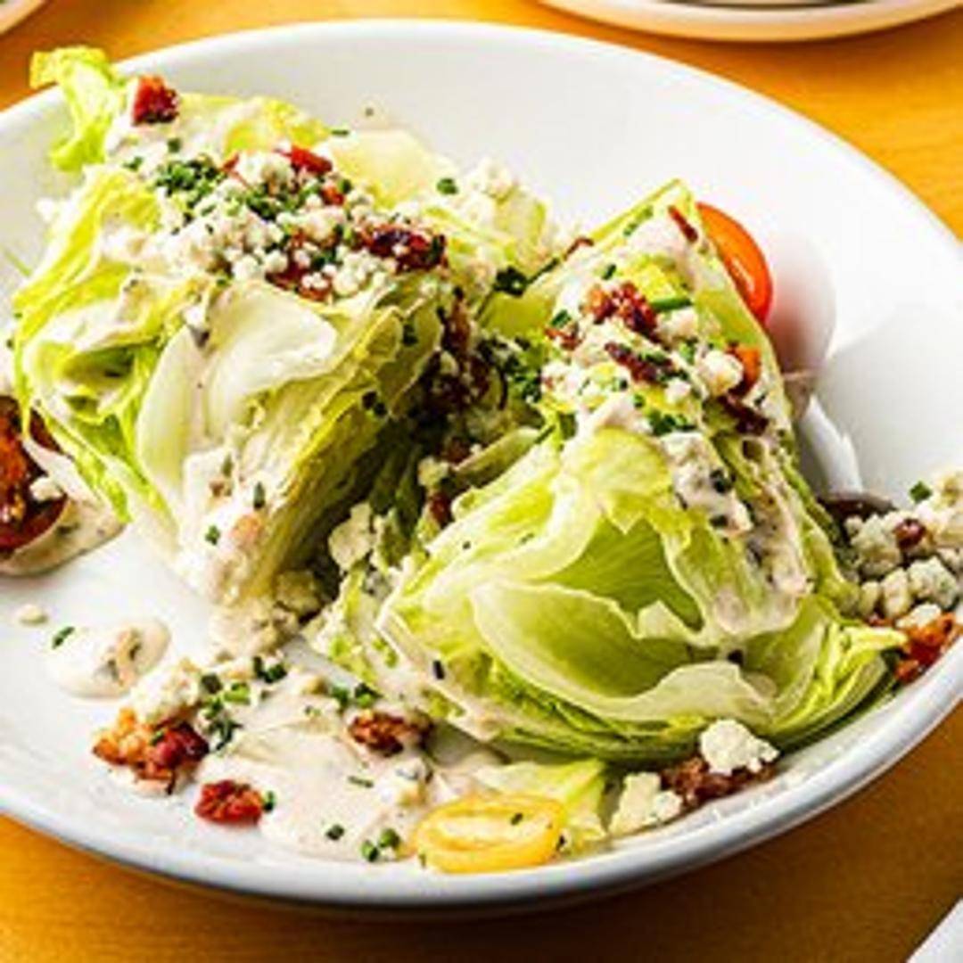 A crisp wedge of iceberg lettuce topped with creamy blue cheese dressing, crispy bacon, tomatoes, and sometimes red onion or chives.