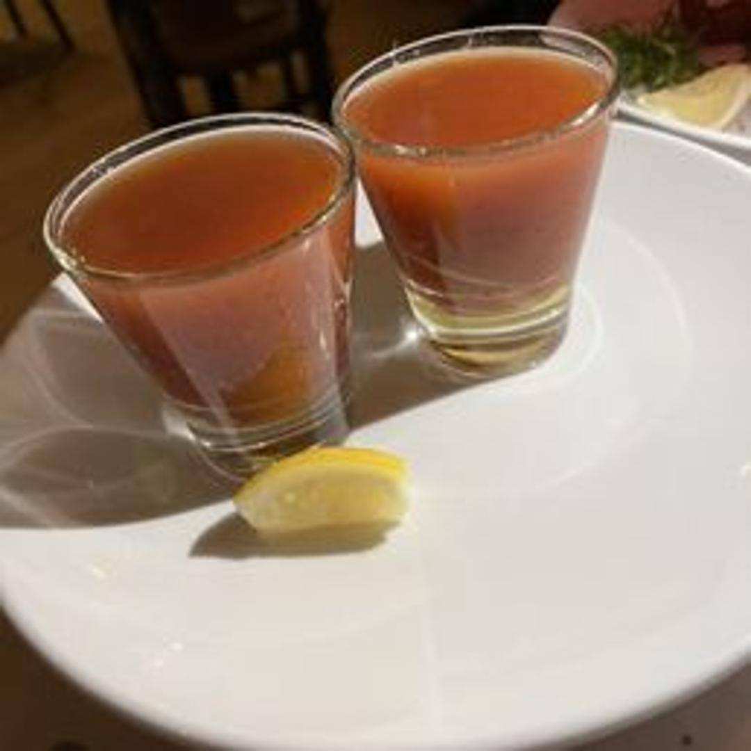 A freshly shucked oyster served in a small glass with a savory cocktail sauce, often including vodka or tequila, horseradish, and other spices for a zesty and refreshing experience.