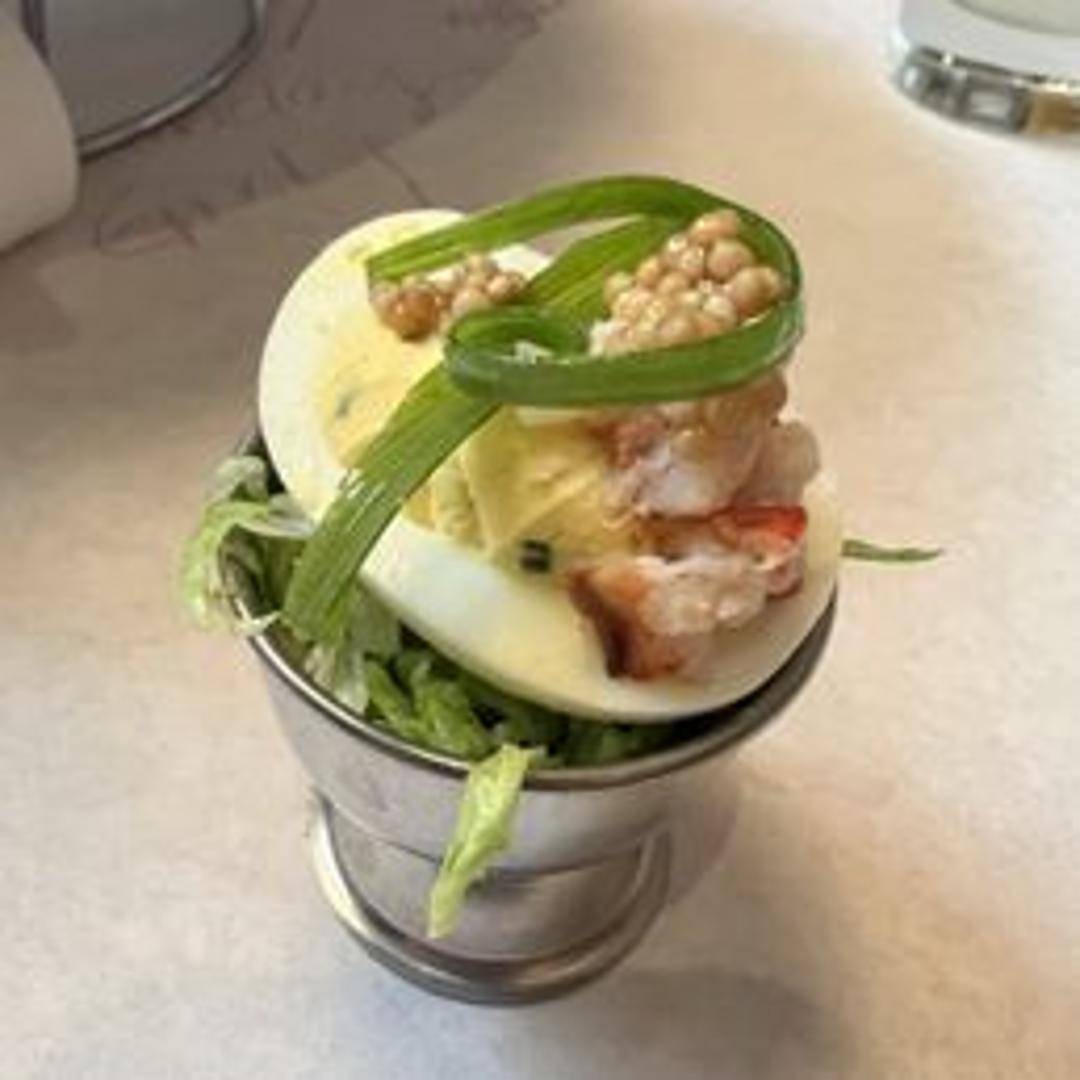 Creamy deviled eggs topped with chunks of fresh lobster meat and a sprinkle of paprika.
