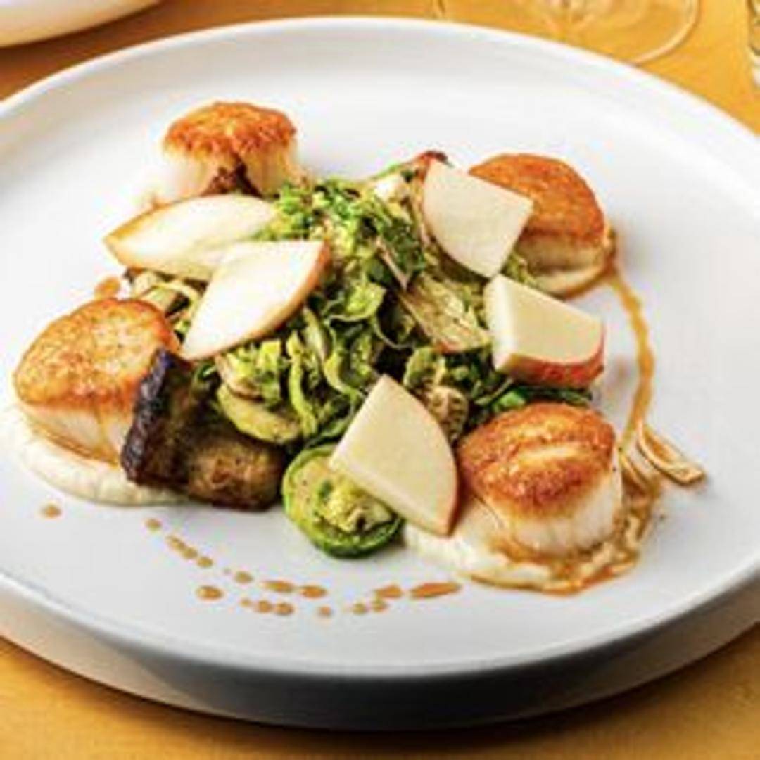 Pan-seared New England Sea Scallops served with a butter sauce and seasonal ingredients.