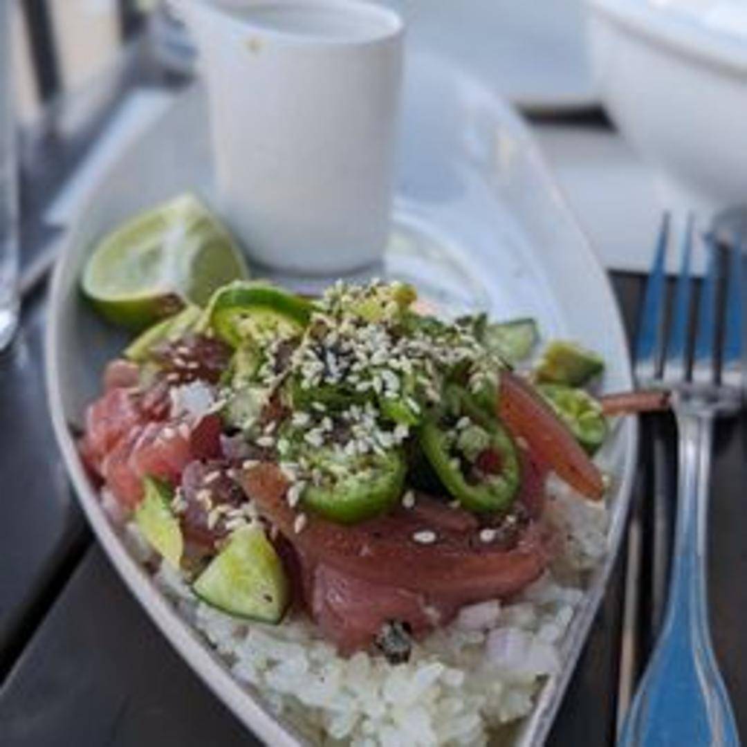 Seared ahi tuna, served rare, with a soy ginger glaze, sesame seeds, and pickled vegetables.