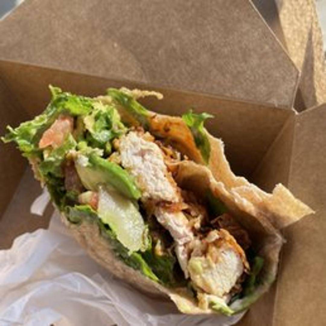 A delicious wrap filled with grilled chicken, fresh lettuce, ripe tomatoes, and a creamy sauce. Served in a soft tortilla wrap.