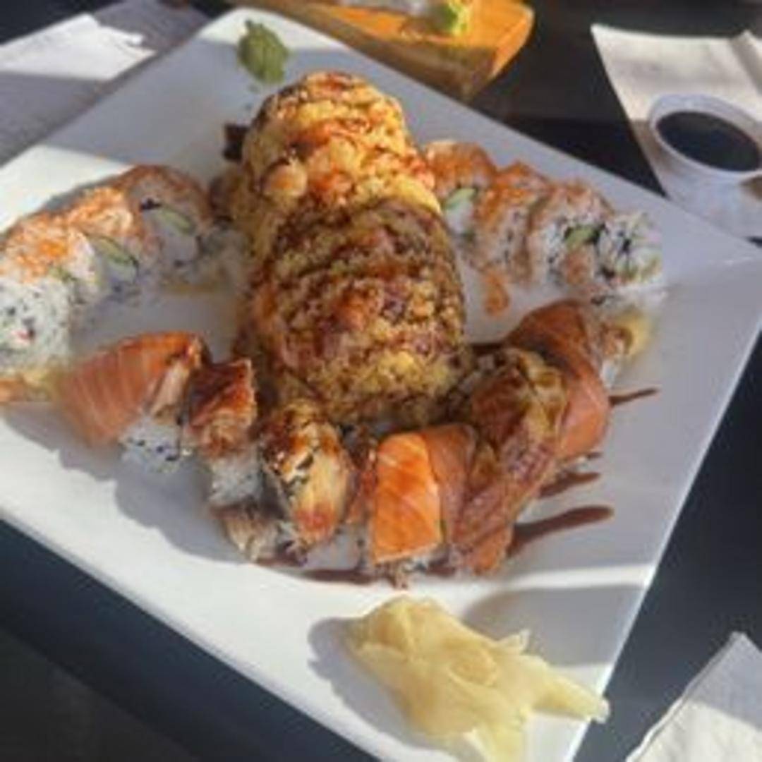 Sushi roll containing imitation crab meat, avocado, and cucumber.