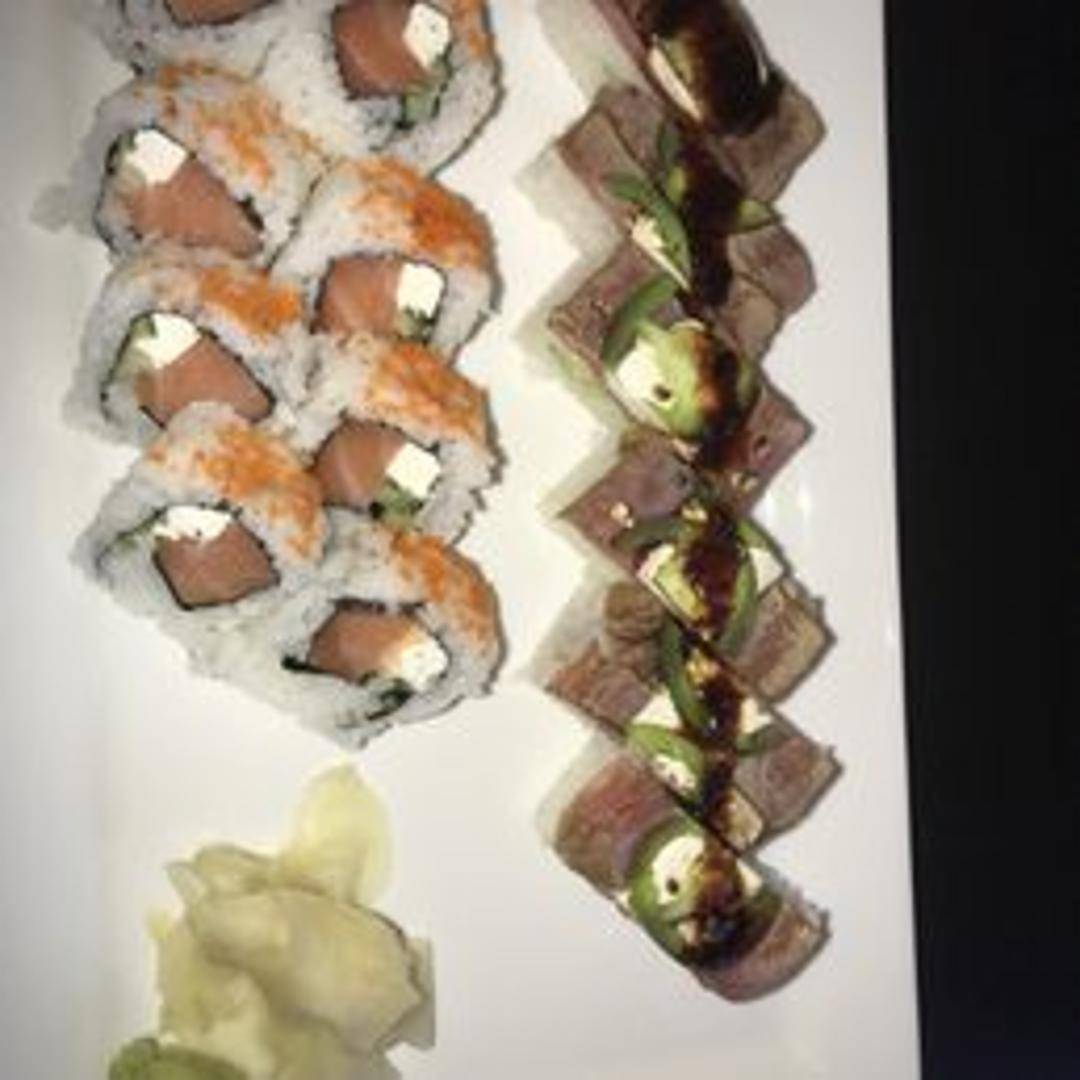 Sushi roll containing smoked salmon, cream cheese, and cucumber.