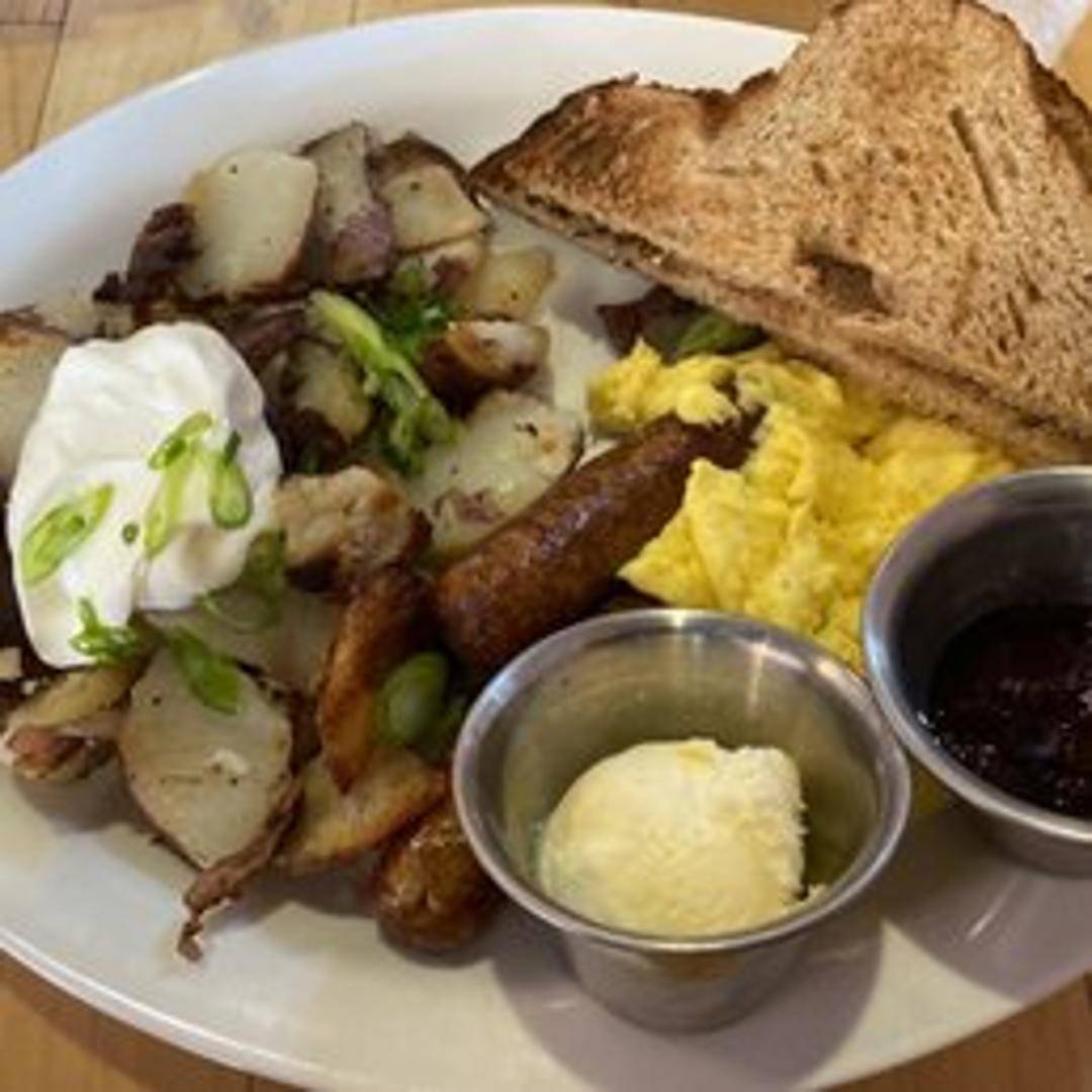 Two eggs cooked your way, served with your choice of bacon, sausage, or ham, and toast or pancakes.