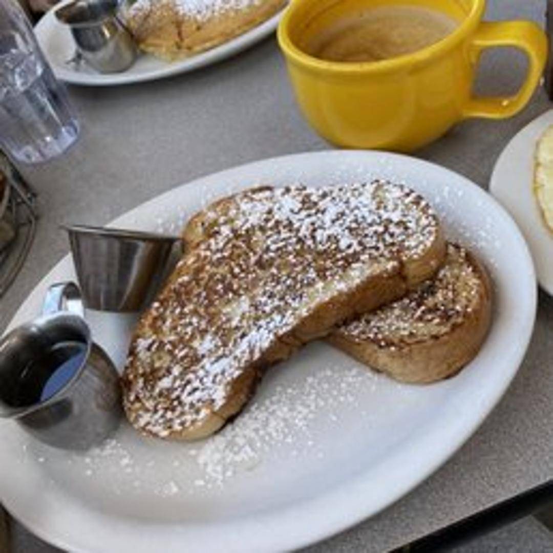 Thick-cut slices of challah bread dipped in a sweet custard batter and grilled to golden perfection. Served with butter and syrup.