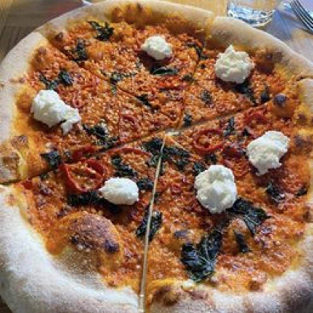 A creamy vodka sauce base, topped with fresh mozzarella, basil, and a sprinkle of Parmesan cheese. Baked to perfection with a slightly charred crust.